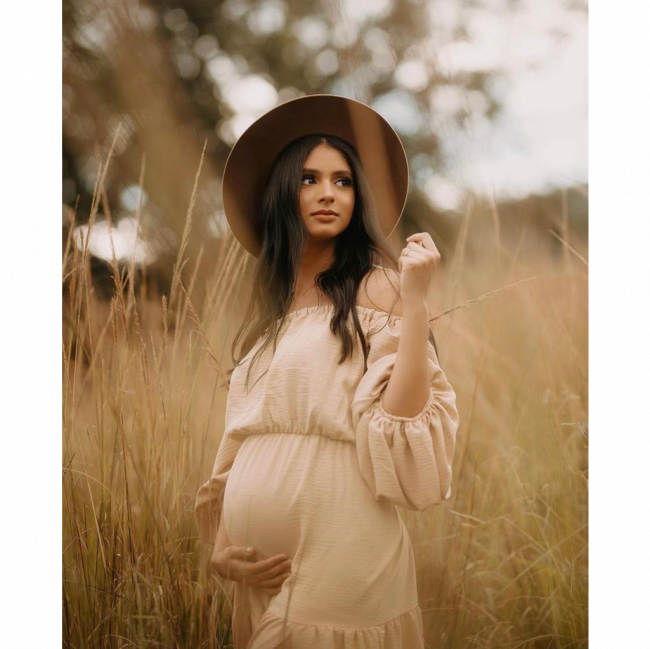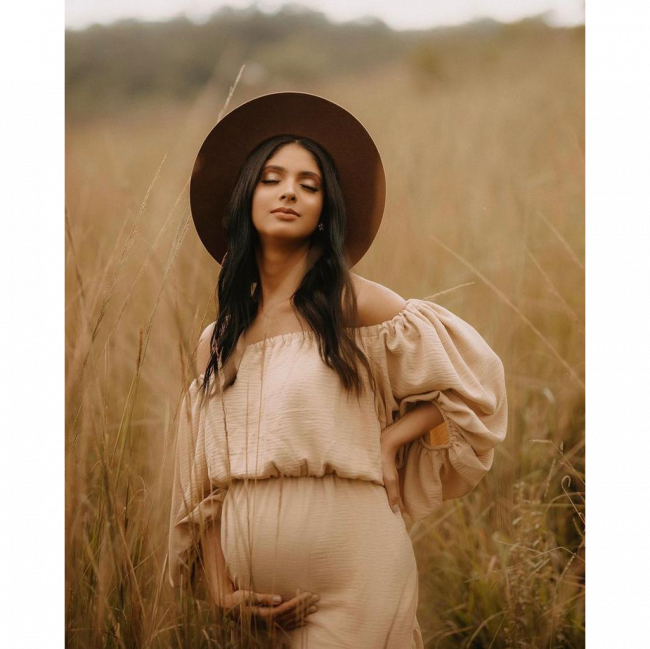 Vestido fluido, com detalhe de fendas , elástico abaixo do busto e nos punhos.